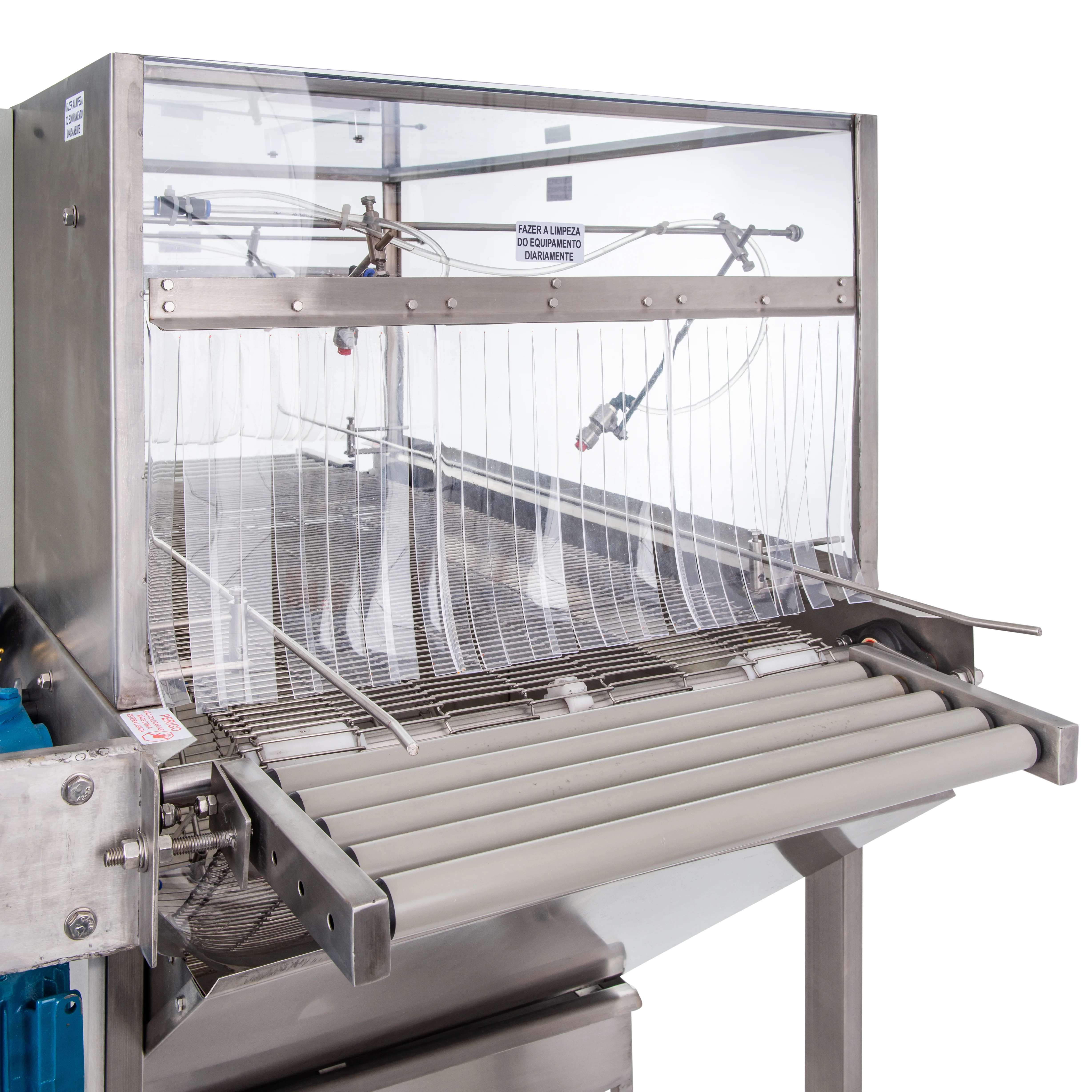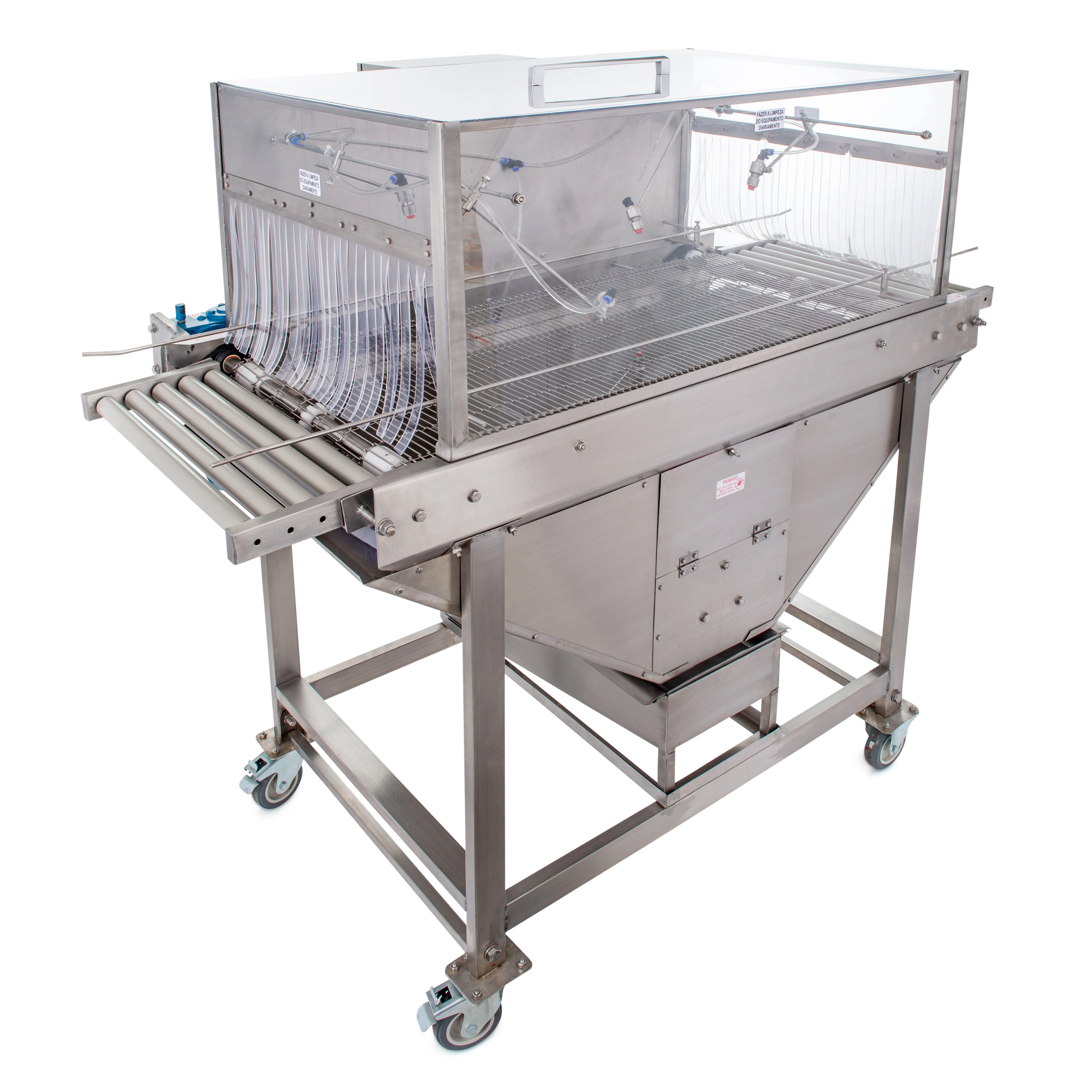 Roletes na entrada e saída do equipamento para fácil acoplagem em outras máquinas e mesas.