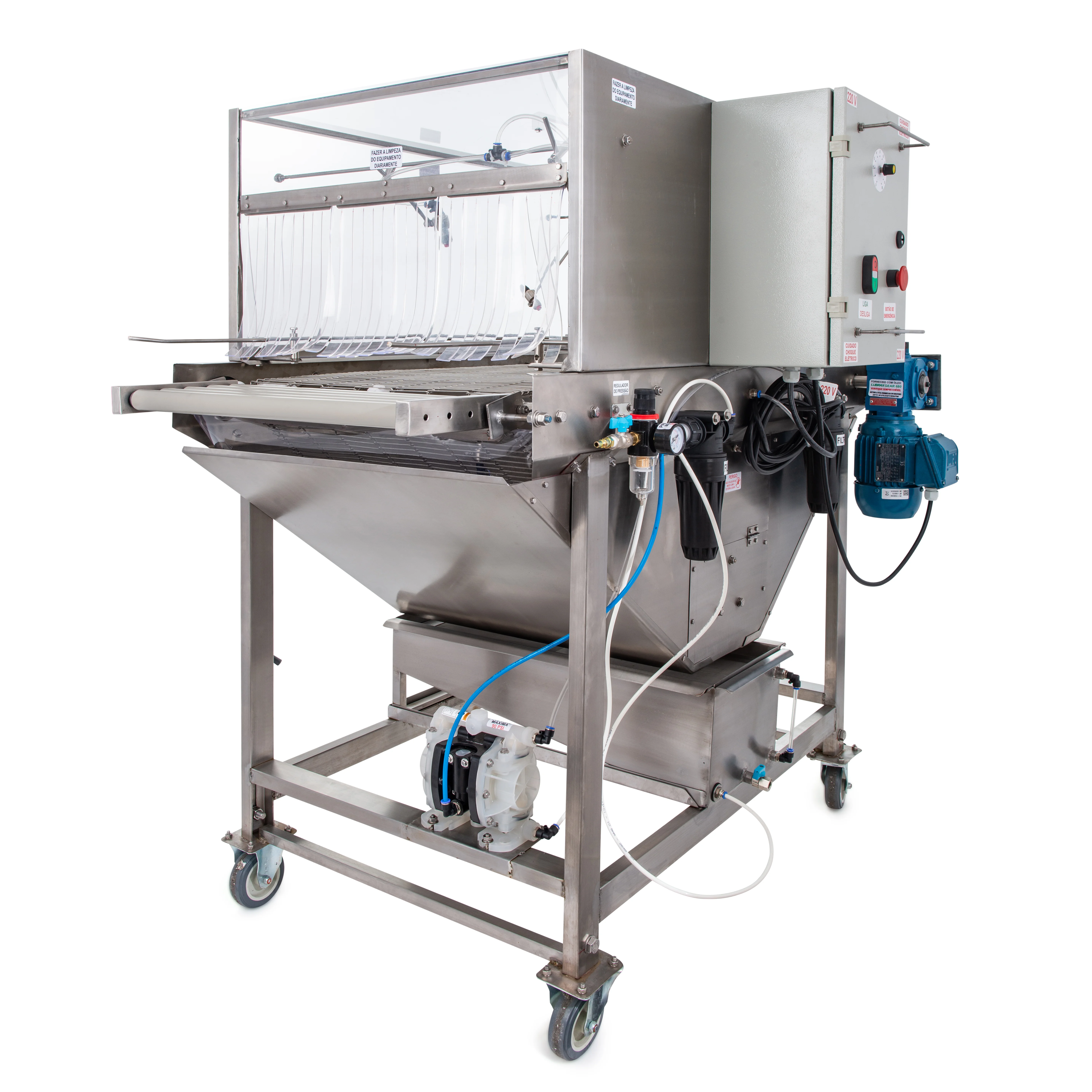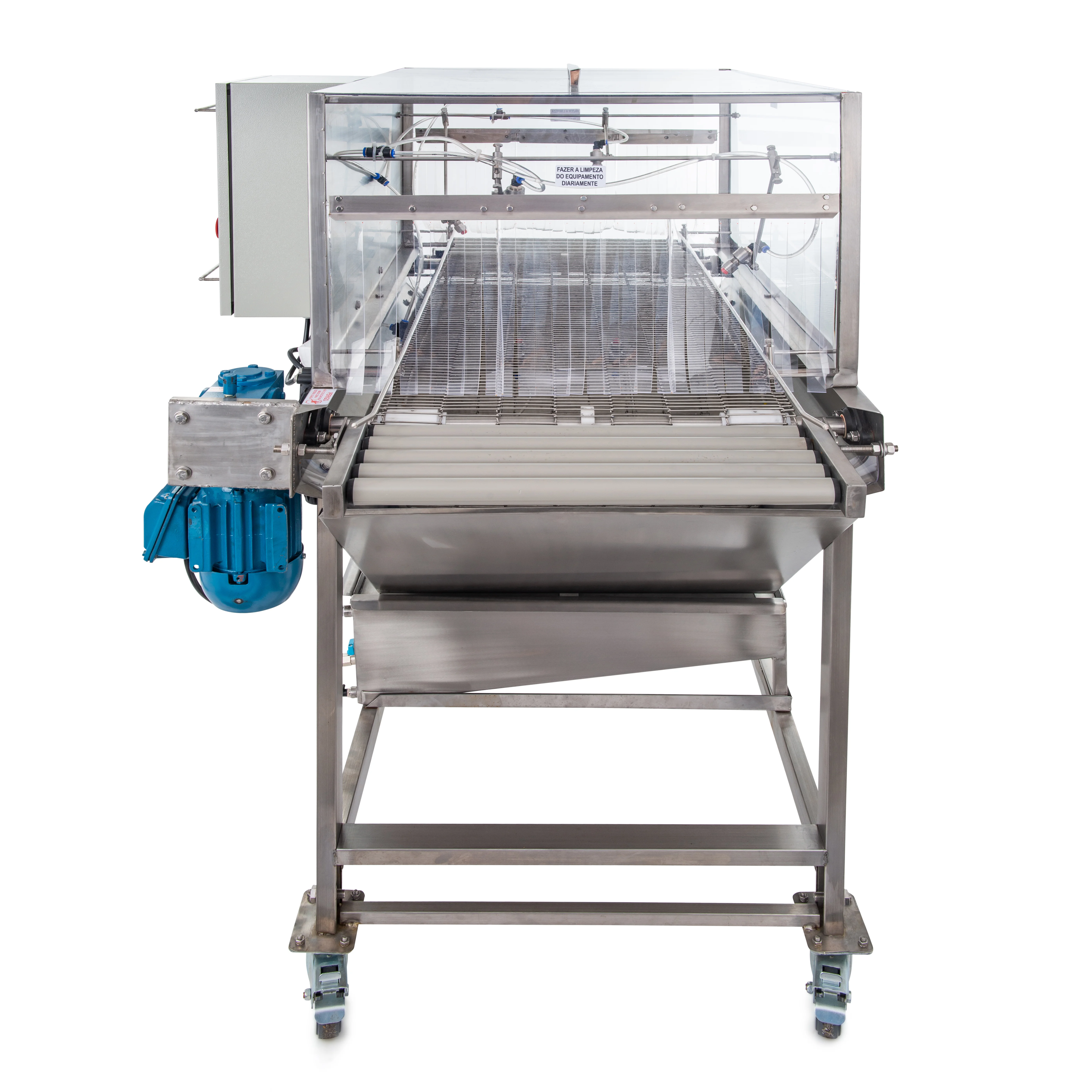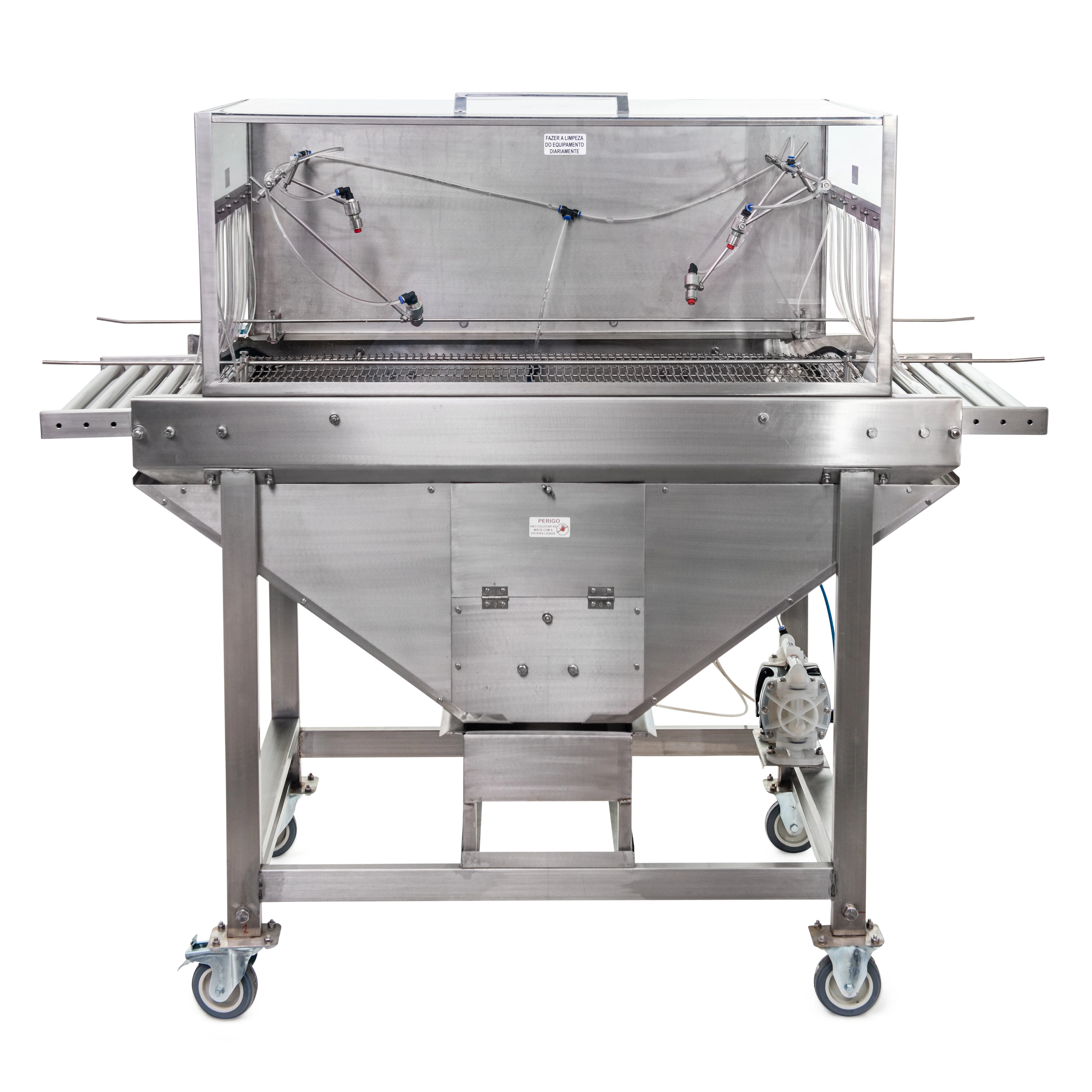 Esteira de aço inox 304 com regulagem de altura e de velocidade.